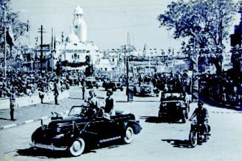 Her Majesty Queen Elizabeth II of Great Britain with Maharana Bhagwat Singh Mewar of Udaipur in a cavalcade passing through Suraj Pol, Udaipur.