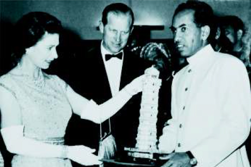 Her Majesty Queen Elizabeth II of Great Britain, accompanied by her husband HRH Prince Philip, The Duke of Edinburgh to Udaipur, Maharana Bhagwat Singh Mewar seen presenting a silver model of The Tower of Victory, Chittorgarh to the Royal visitors.
