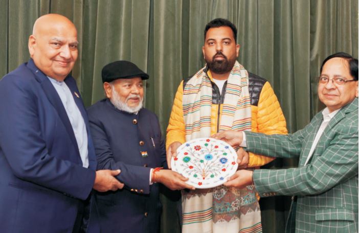 Meeting with Mr. Satya Bhushan Jain Mr. Satya Bhushan Jain, Vice President, Confederation of All India Traders (CAII) accompanied by Mr. R. G. Agarwal, Chairman, Dhanuka Group and Mr. M.K. Dhunuka, Managing Director, Dhanuka Group called on Mr. Lakshyaraj Singh Mewar at The City Palace, Udaipur.