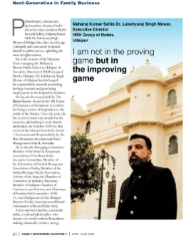 Publication: Family Enterprise (ISB) Extract from the article entitled: Next-Generation in Family Business Page: 21 - 23 Edition: April-June 2023 For complete article please go to: http://hrhhotels.com/mediaBuzz/gallery.html?id=91 Article snippet:A brief article on Mr. Lakshyaraj Singh Mewar as a philanthropist, educationist, sports patron, business leader and seven times Gunness World record holder featuring in the next-generation in family business of ISB.