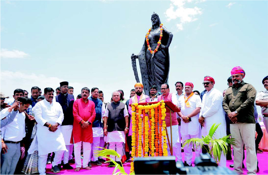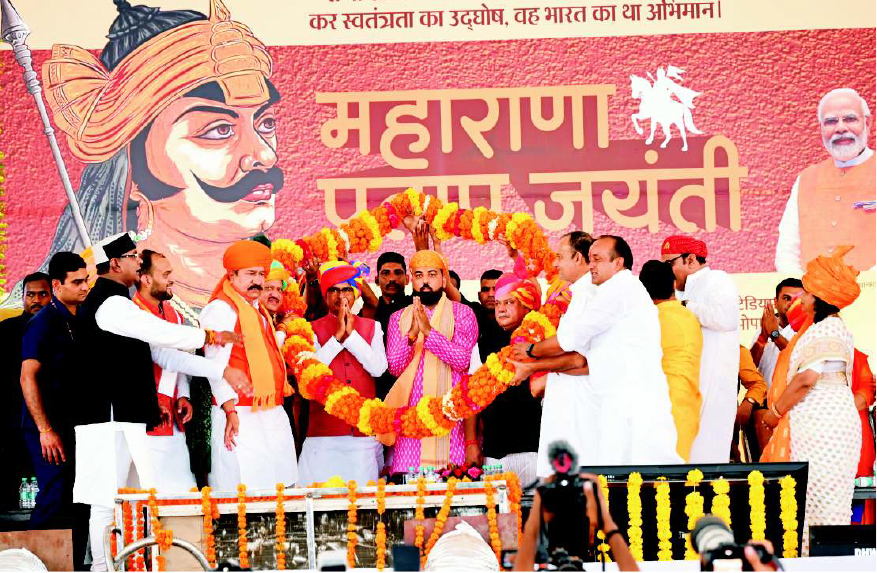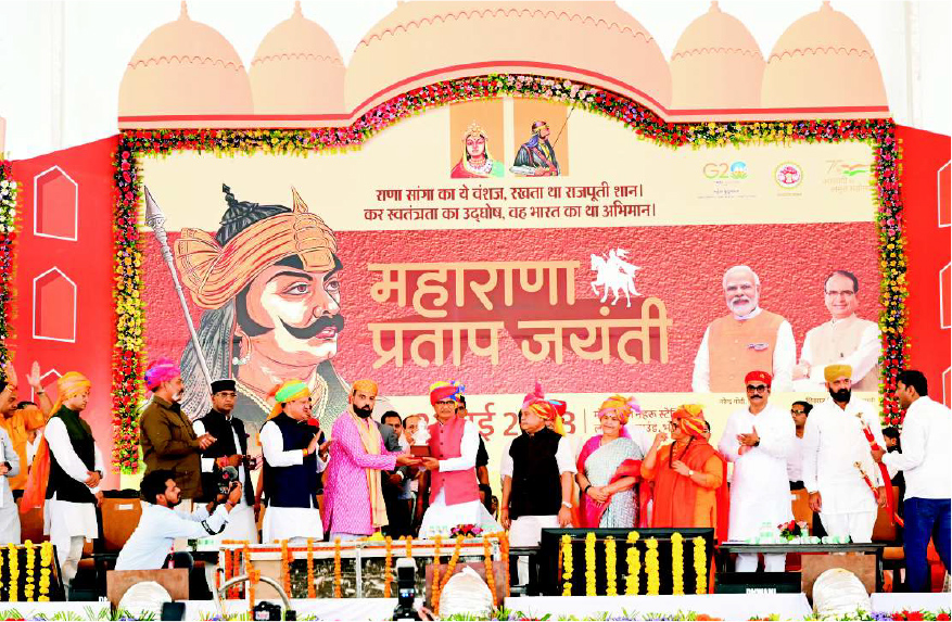 At Bhopal, Madhya Pradesh Mr. Mewar visited Bhopal, where he was accompanied by the Chief Minister of Madhya Pradesh, Mr. Shivraj Singh Chouhan. Together, they unveiled a grand 15-foot statue of Rani Padmavati at Manuabhan Tekri. Mr. Mewar then attended the Maharana Pratap Jayanti celebrations at Motilal Nehru Stadium near Lal Parade Ground. He presented the soil of Haldi Ghati to the Chief Minister, who was also joined by Union Minister Shri Narendra Singh Tomar. The Chief Minister announced that a grand memorial will be built for Maharana Pratap, Chetak, and their other associates in Bhopal. The memorial will showcase their life philosophies and bravery, and will be included in the textbooks of Madhya Pradesh so that future generations can learn about them. Mewar also addressed the gathering.