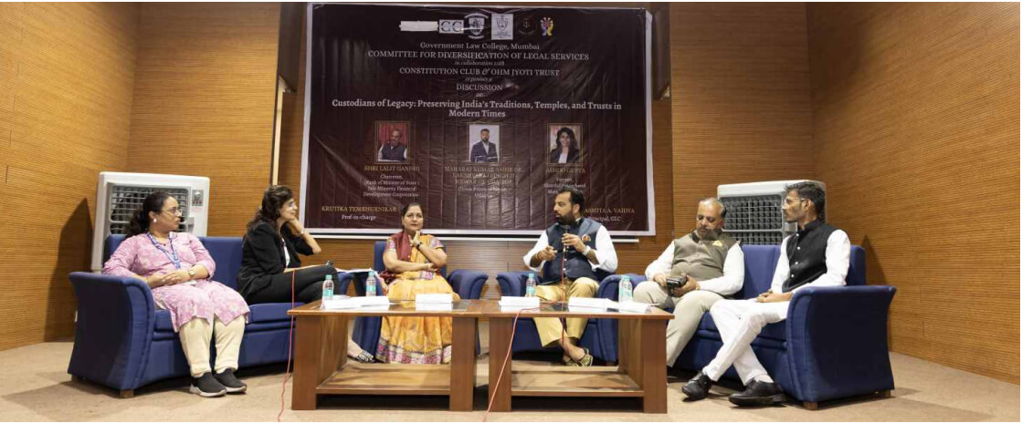 Thu, 16 Jan Preserving India's Heritage: Insights from the Custodians of Legacy Panel Discussion The panel discussion titled "Custodians of Legacy - Preserving India's Traditions, Temples, and Trusts in Modern Times" was held on 16 January 2025 at the GLC Auditorium, Government Law College, Churchgate, Mumbai. Organized by the Committee for Diversification of Legal Services in collaboration with the Constitution Club and Ohm Jyoti Trust, the event brought together distinguished experts to explore the vital role of custodians in safeguarding India's rich cultural and legal heritage. Focusing on the preservation and management of temples and trusts, the discussion addressed the |
